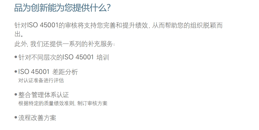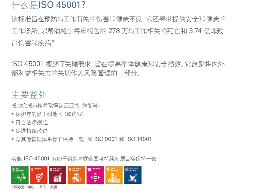 ISO 45001,这一国际标准化组织 (ISO) 用来取代OHSAS 18001的新的职业健康和安全管理体系标准已在2016年出版,这一新标准用于帮助全世界的组织确保其工作者的健康和安全。本标准的定位是替代已在全球通行的OHSAS 18001标准,最终目标仍然是为了提高现有职业健康和安全绩效。为改善全球供应链的工作安全提供了一套强大而有效的流程。旨在帮助各种规模和行业的组织,新的国际标准有望减少全世界的工作场所伤害和疾病。ISO 45001为政府机构、行业和其他受影响的利益相关者提供有效、可用的指导,以改善世界各国的工作人员安全。通过易于使用的框架,它可以应用于工厂和生产设施,而无论其位于何处。 ISO 45001 是新的 OHSMS 国际标准,尽管与 OHSAS 18001 相似,新的 ISO 45001 标准采用了经过修订的全新 ISO 管理体系标准中的附件 SL 顶层框架。 由于ISO 45001旨在与其他ISO管理系统标准整合,确保与新版ISO 9001(质量管理)和ISO 14001(环境管理)的高度兼容性,已经实施ISO标准的企业如果决定开展ISO 45001工作,将会占有优势。随着企业规模扩大和生产集约化程度的提高,对企业的质量管理和经营模式提出了更高的要求。企业必须采用现代化的管理模式,使包括安全生产管理在内的所有生产经营活动科学化、规范化和法制化。